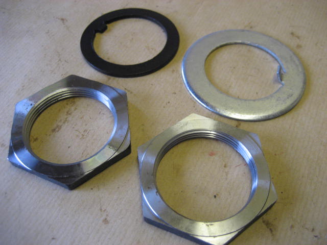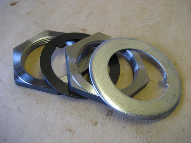 Sett med mutter, mellomskive og låseblikk for feste av hjullager. Dette passer til Willys MBNB - settet er merket Ford GPW men medfølger låseblikk for Willys MB
